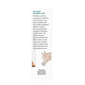 Pet Relax is manufactured in the UK. It is marketed in over 35 countries. Pet Relax is a natural product that contains essential oils with an attractive aroma to cats and dogs. The pleasant aroma helps distract pets that are experiencing stress or anxiety. Pet Relax is suitable for all mammals and birds.